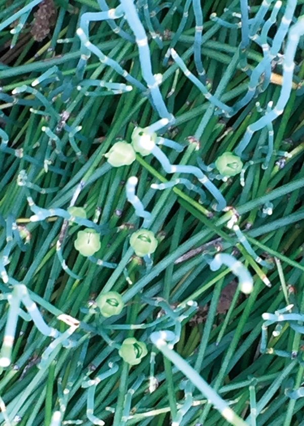 ハーブ類ではマロウ、タイム、コーンフラワーなど数多くの種類が花開いて華やぎ、生薬ではトウキやスイカズラの金銀花が花盛りでした。中でも珍しかったのはマオウの花 。説明されるまでは花とは気がつかず根元にたくさん咲いていた小花を見逃すところでした。 その他、毒草なども多数あったので興味深く観察しました。