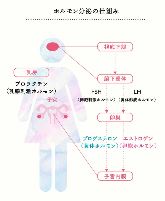 女性ホルモンの分泌をつかさどっているのは、脳の視床下部。視床下部が脳下垂体にホルモン分泌の命令を出すと、 脳下垂体が卵胞刺激ホルモン(FSH)と黄体形成ホルモン(LH)を分泌。これらが卵巣に作用して、エストロゲンとプロ ゲステロンが分泌されます。