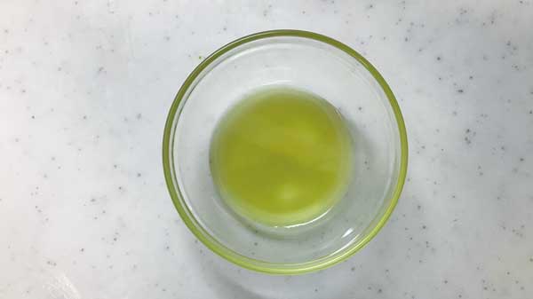 ❹ オイルを冷まし、ハーブを漉す。遮光瓶に移す。きれいなグリーンのハーバルオイルの完成 !