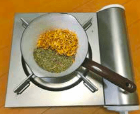 ❶ ハーブと水を小鍋に入れ、煎剤を作る。10分ほど弱火にかけ、水溶性成分を抽出。