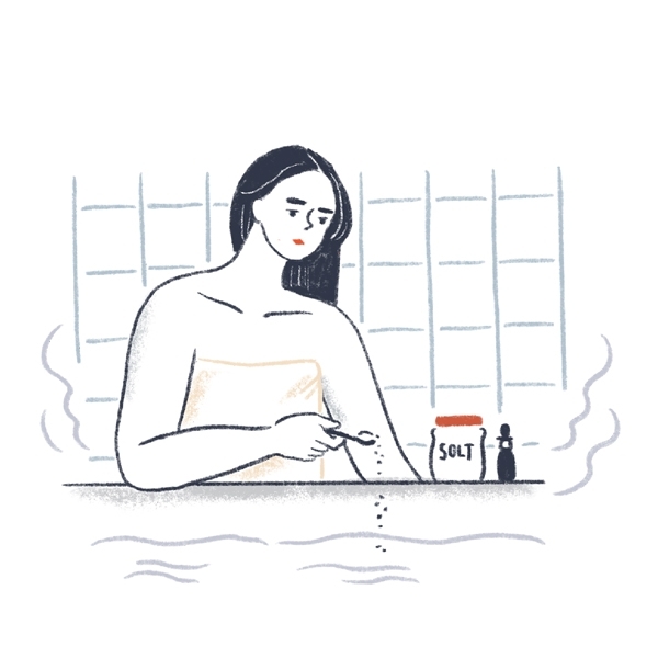 大さじ2杯の塩にティートリー精油5滴を混ぜてバスソルトをつくる。お風呂に入れて体を温め、早めに寝る。蒸気と共に精油が吸入され鼻づまりや喉痛にも有効。