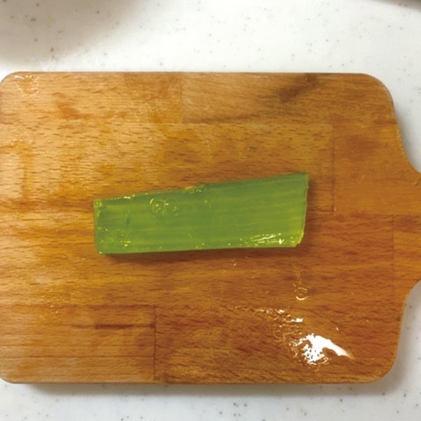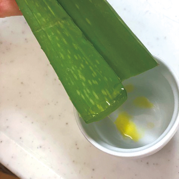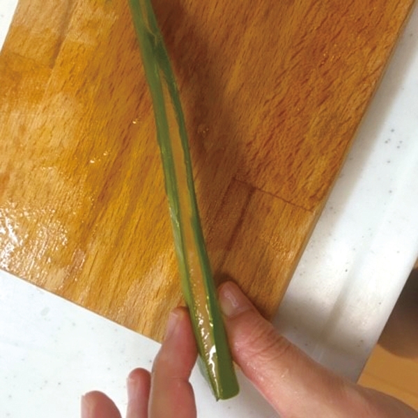 ①庭にあるアロエをカット。切るとすぐに苦味の強い、黄色の汁が出ます。下剤にも使われるアロエラテックと呼ばれる汁は、痒みを感じる場合もあるので、手についたら洗い流してください。黄色の汁を出すため、10分ほど立てておきます。