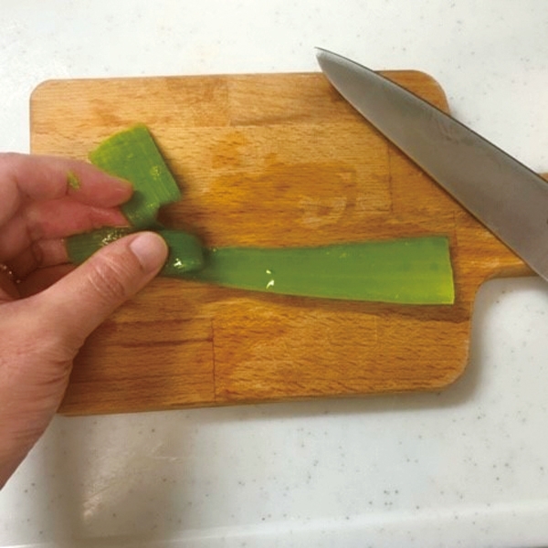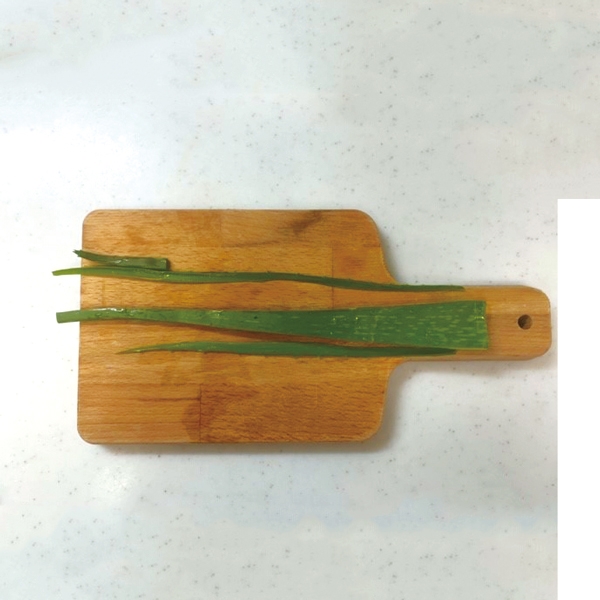 ②アロエの先端と両脇をカットさらに、アロエの片側側面の皮をナイフでスライスのようにカット。