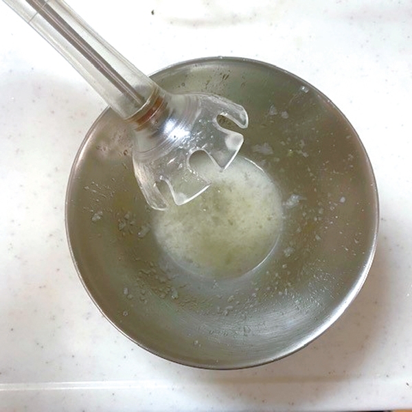 ④水分を切り、マカダミアナッツオイルを入れ、ブレンダーで混ぜたらボトルに入れて、お風呂上がりなどの清潔なお肌にたっぷり使ってください。