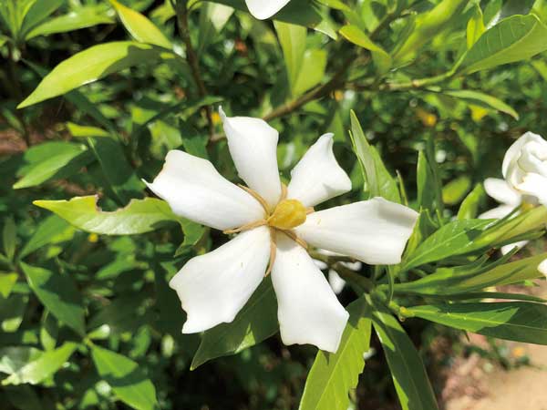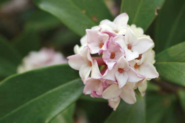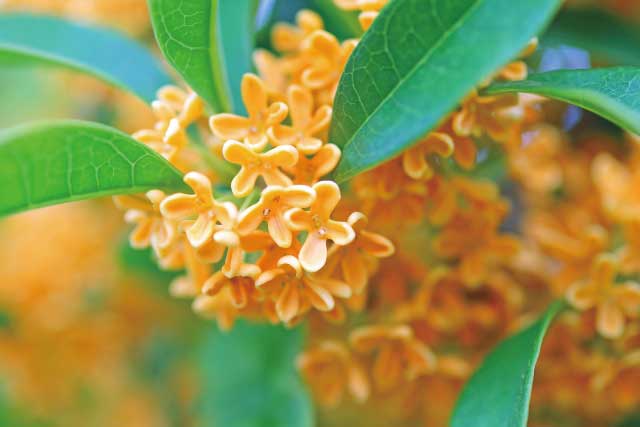 春を告げる香りといえばジンチョウゲ。普段は目立たない木ですが、この香りを嗅ぐと春が来たと感じます。花に見える部分はがくが花弁状になったもの。雌雄異株なので目にする物はほとんどが雄花のようです。初夏になると甘い香りが漂うガーデニアとも呼ばれる白くてきれいなクチナシの花は、八重咲きの物と一重咲きの物があります。きんとんの色づけに欠かせないハーブ・クチナシの実は、一重咲きの花にだけつきます。秋の定番ではキンモクセイ。この香りは誰もが懐かしいと感じる香りです。中国から伝わった樹木で、ジンチョウゲと同じくこちらも雌雄異株。私たちが楽しんでいるのは雄花になります。挿し木で増やすため、もしかしたら日本のキンモクセイの遺伝子は全て同じかもしれません。これらジンチョウゲ、クチナシ、キンモクセイを三大香木ともいいます。