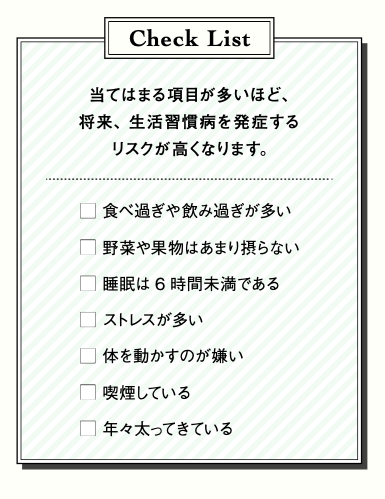 健康には生まれもった体質だけでなく、生活習慣が深くかかわっています。10年、20年後にも高い QOL(生活の質)を維持するために、現在のライフスタイルを見直し、病気になりにくい体をつくりましょう。