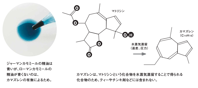カマズレンは、マトリシンという化合物を水蒸気蒸留することで得られる化合物のため、ティーやチンキ剤などには含まれない。