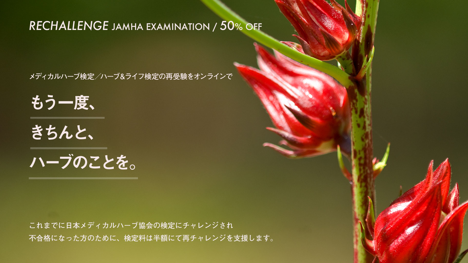 このようなことからも、これまで検定試験を受験された方を対象に、検定料を半額としみなさまの再チャレンジを応援させていただきたく存じます。今回は現在の社会情勢を考慮して、検定試験のすべてオンライン試験となりました。ご自宅からでもご気軽に受験されることができると思われますので、この機会に是非再チャレンジをして、より充実したハーバルライフを目指していただけますことを心からお願い申し上げます。