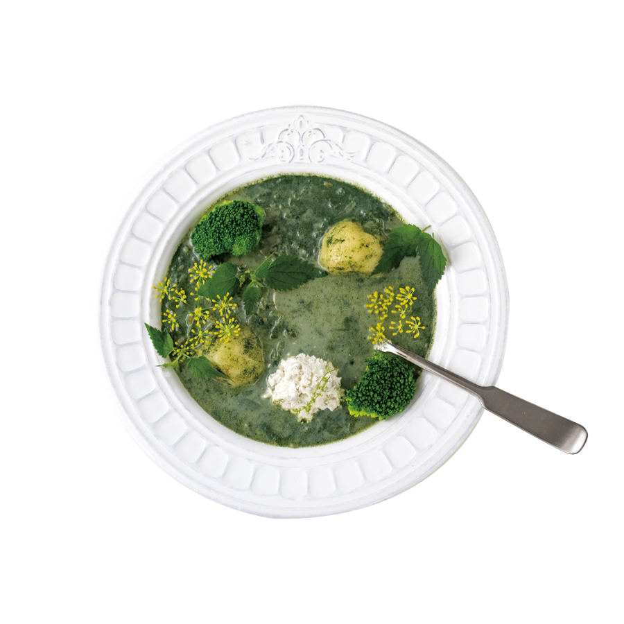 7.大きめのスープボウルに盛り、フェンネルサワークリームとネトルの葉やフェンネルの花などを飾る。