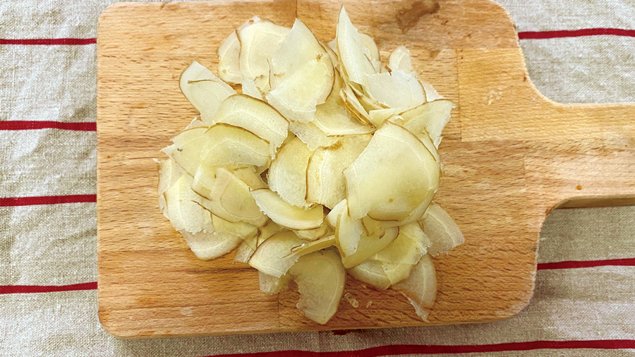①ショウガをよく洗い、スライスする。