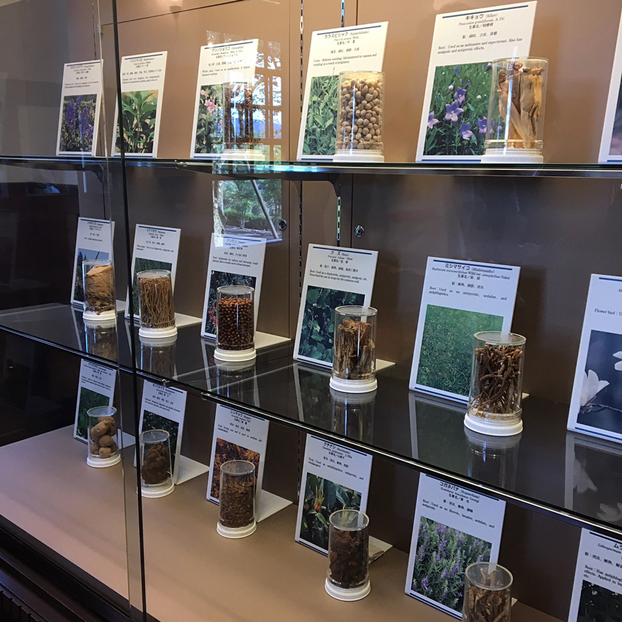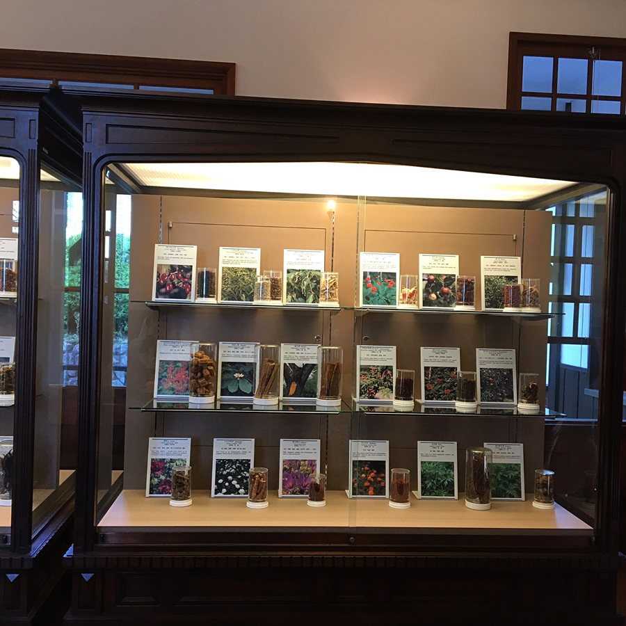 まずは、展示棟へ。明治41年(1908年)神戸市東灘区に野口孫市氏が設計され、1995年の阪神・淡路大震災後に移築、再生された建物には生薬の標本を中心に展示されており、百味箪笥、薬研、乳鉢、薬缶などの生薬に関するさまざまなものも見ることができます。