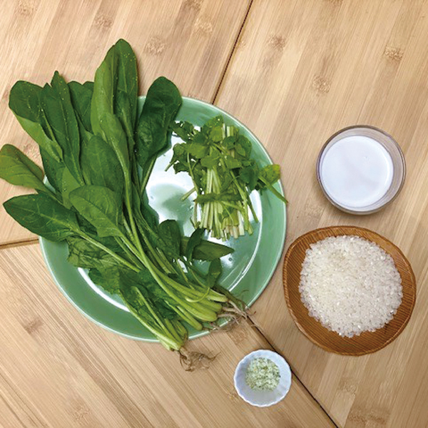 スリランカのお粥、コラキャンダ。シンハラ語でコラ=緑・葉、キャンダ=お粥の意味。春は凍っていた大地が溶け、水分になるように、心身共に重くなりやすくなるとアーユルヴェーダでは考えますが、苦味や渋味のある食べ物は、その重だるさを解消してくれます。温かく消化によいお粥は、特に朝食に摂るのがおすすめです。スリランカでは、ゴーツコーラやカラピンチャ(カレーリーフ)を使いますが、今回は日本で作りやすい、ほうれんそうとセリを使いました。