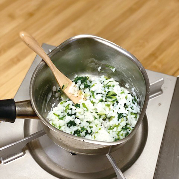 ①水洗いしたお米、水、ハーブソルトを小鍋に入れ、お米が柔らかくなるまで炊く。