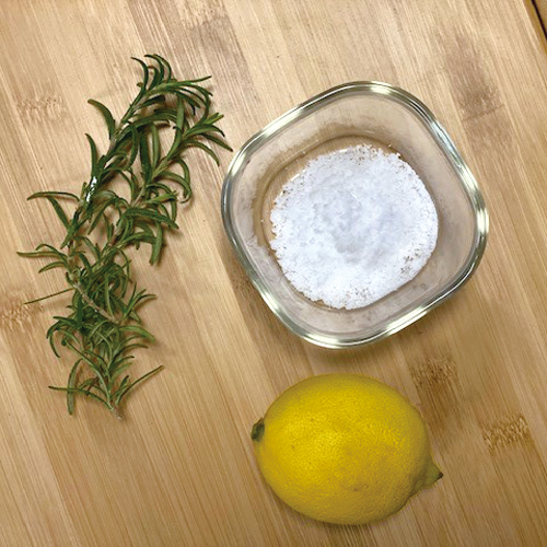 ❶ローズマリーは枝の部分を除き、耐熱容器にのせ、レンジで乾燥するまで加熱する(自然乾燥でもOK)。