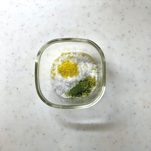 ❸レモンの皮をおろし、キッチンペーパーにのせ、レンジで30秒ほど加熱する。