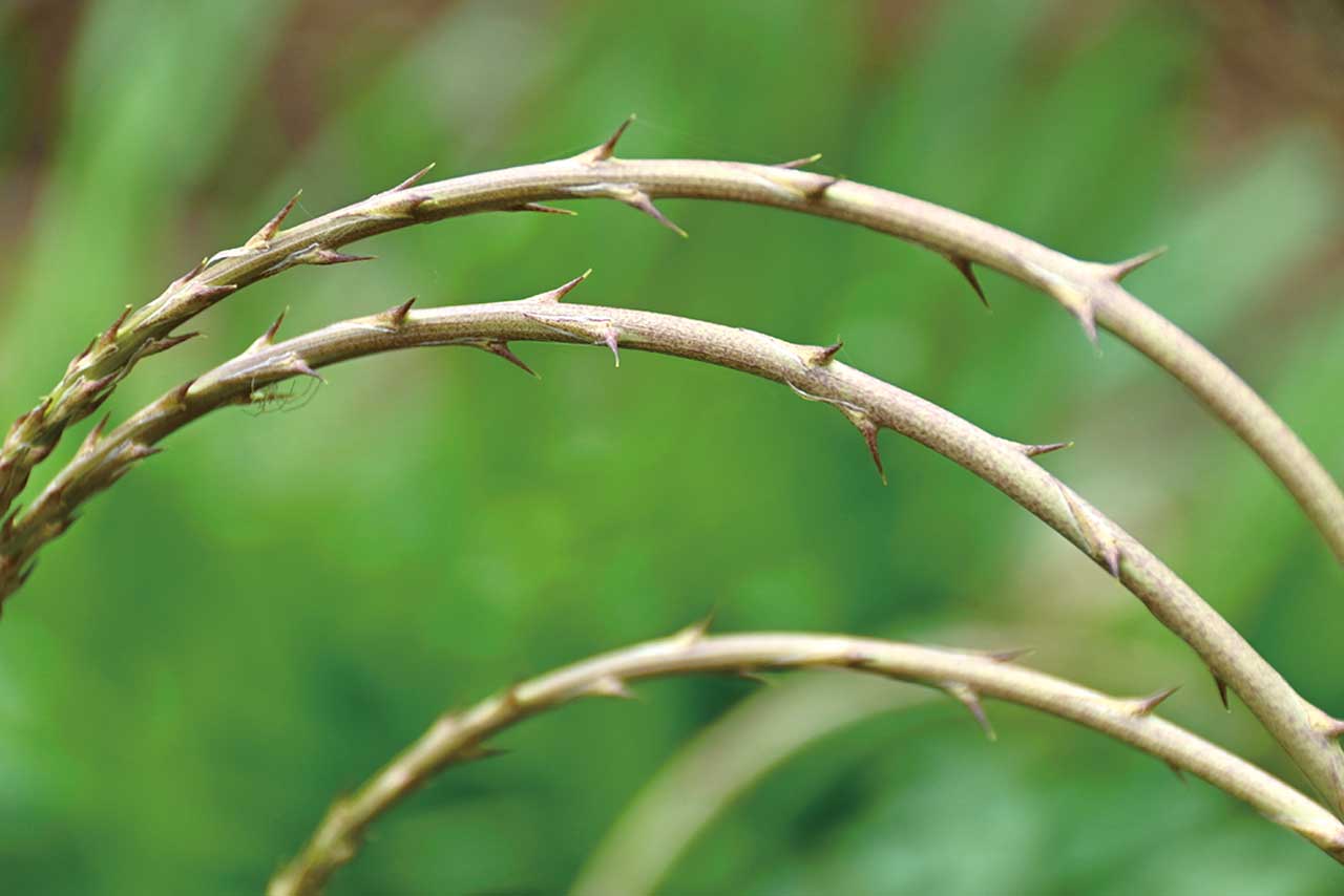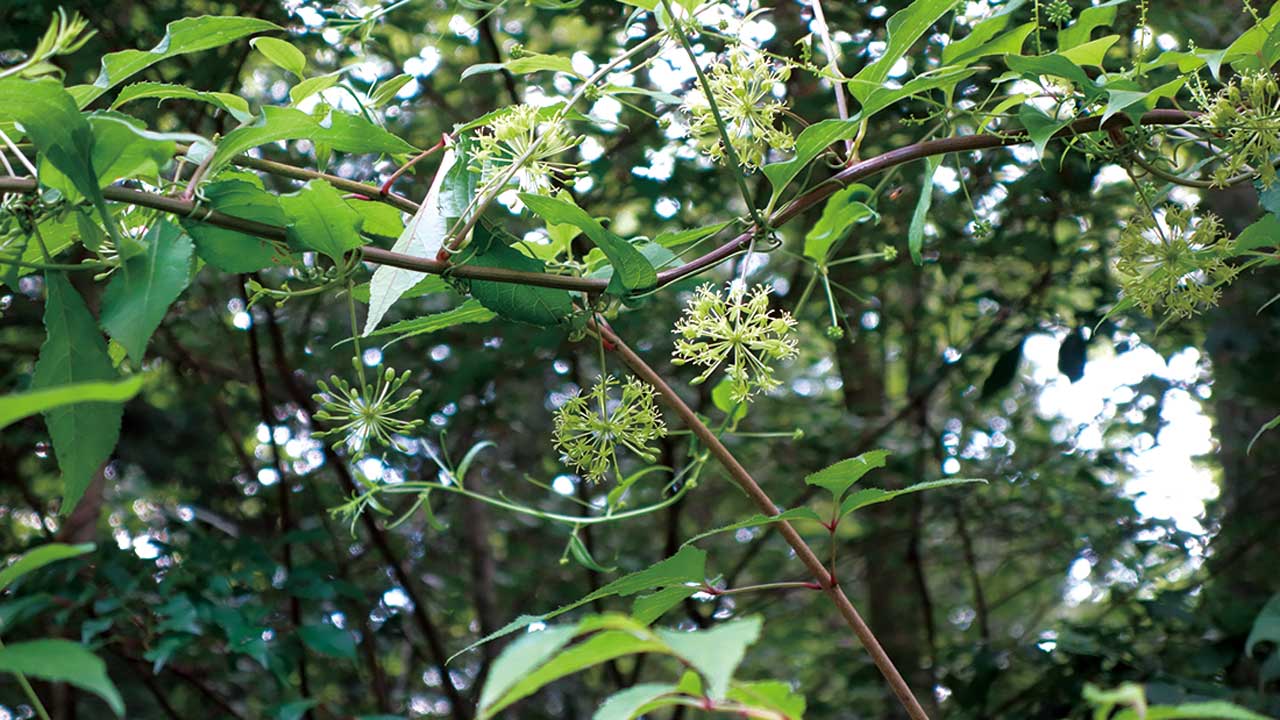 つる性の多年草。短い根茎に、紡錘形に肥大した多数の塊茎が束生する。茎は下部が木化し、上部はつる性となって他物に巻きつく。分枝がきわめて多く、葉のように見えるのは葉状枝である。細枝に付く葉は広卵形、膜質で小さく、太枝に付く葉は外曲するトゲに変化している。葉腋に淡黄色の小花を2〜3個ずつ付ける。花は雌雄異株、広鐘形で長さ2〜3㎜、淡黄緑色。果実は小球形で、汚れた白色、中に黒い種子が1個ある。