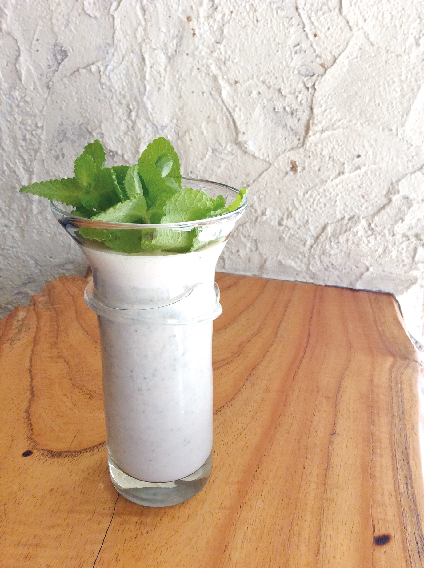 ❷豆乳を加えて撹拌する。滑らかになったらミントの葉を加え、さらに滑らかになるまで攪拌する。