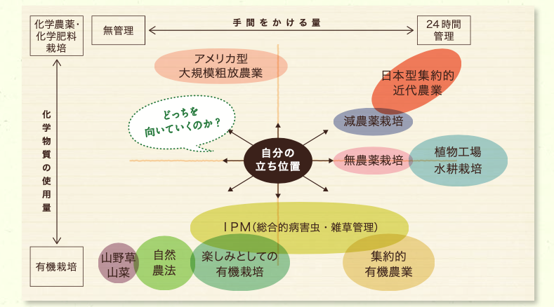 これまでこの連載でご紹介してきた有機栽培は、図中の「楽しみとしての有機栽培」にあたります。図の右や上に向かう方向は、生産性や営利を大切にする方向で、下に向かう方向は生態系を大切にする方向といえます。皆さんがどのあたりで栽培を楽しもうとしているのかの参考にしていただければと思います。石灰を使うのか使わないのか、畑を耕すのか耕さないのか、虫や雑草を取るのか取らないか、取るとしたらどのような方法でどのくらい取るかなど、それぞれに目的と理由があってどれも間違いではありません。