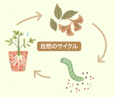 植物が光合成でCO²とH²OからCHO(有機物)を作り、それを草食動物が食べ、肉食動物が食べ、動植物の死骸や糞が土壌中の小動物や微生物によって分解され、その分解産物を植物が栄養とするといった、食物連鎖や、自然のサイクル、香りや薬効成分などによる生き物同士のつながりなど、生態系の仕組みの中で栽培をするのが有機栽培です。そのために、生き物全体の健康を守る必要があります。