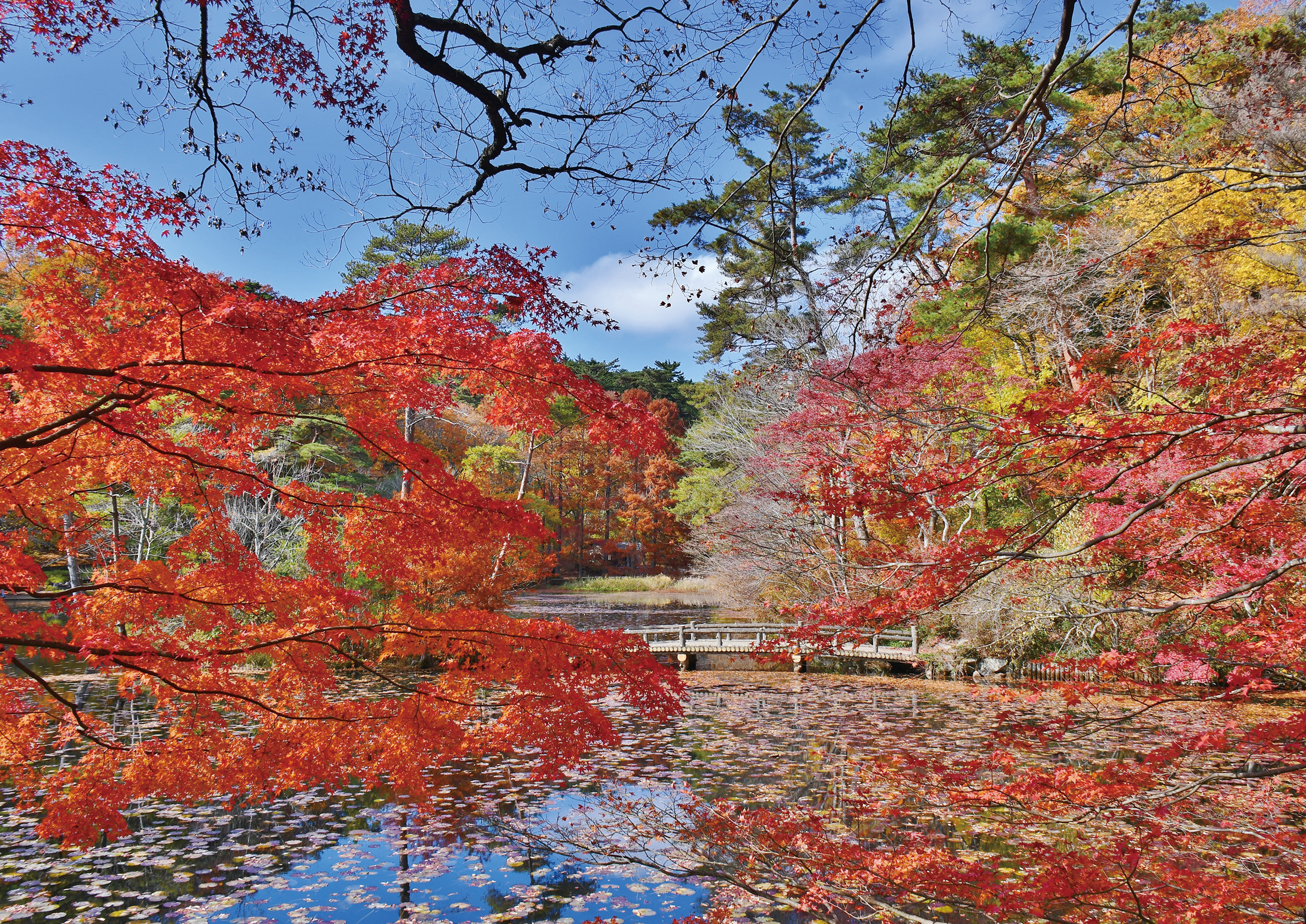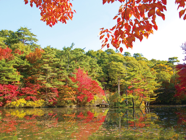 園の中心地にあり、春は新緑、初夏はスイレンやアサザなどの水辺植物たちが四季折々の池の美しさを演出しています。水面に映るハナノキや各種カエデの紅葉は特に美しく、人気の紅葉スポットになっています。