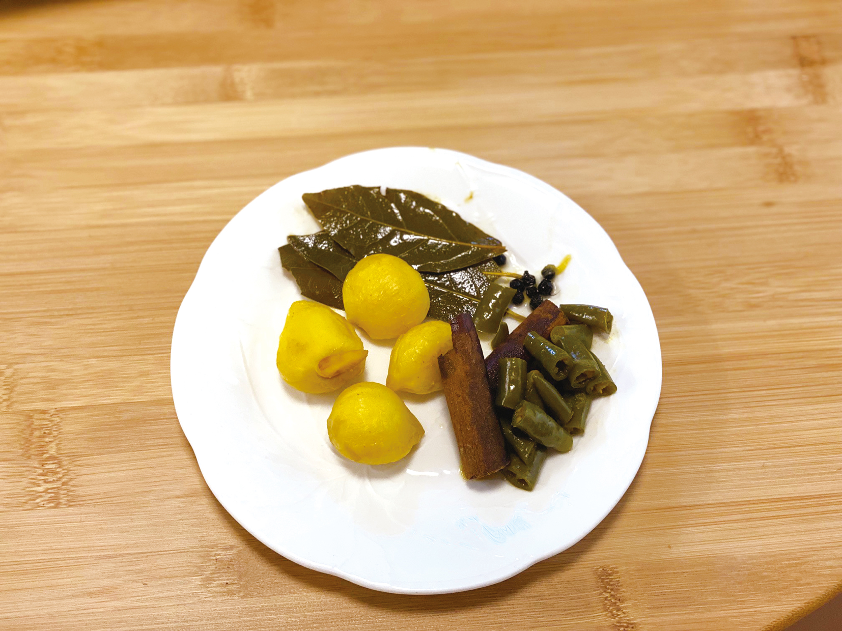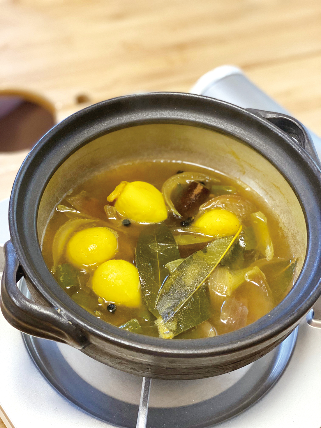 - 煮詰めたら、スパイスを取り出す(取り出したスパイスもおいしくいただけます)。