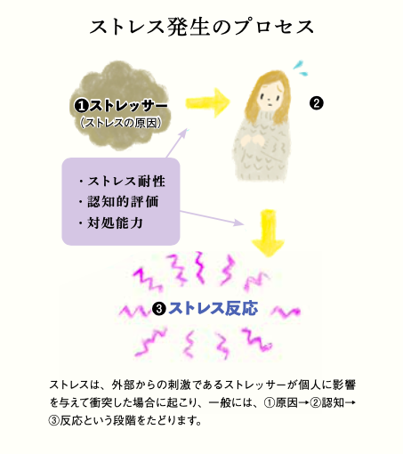 ストレスがあるからといって必ずしもこうしたストレス反応が出るとは限らず、反応の現れ方も個人のストレス耐性によって異なります。