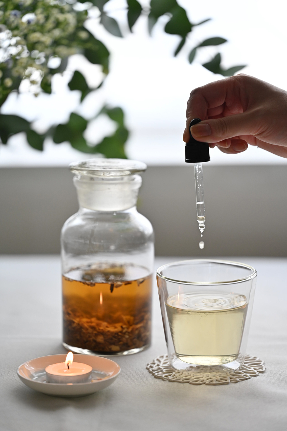 〔用具〕広口のガラス瓶、茶こし、遮光性の保存瓶
