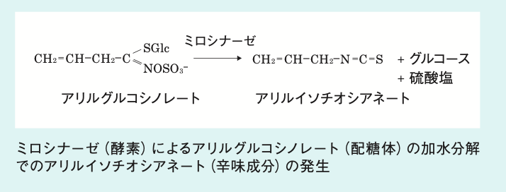 ニンニクをはじめとするアリウムクロップス(ネギ類)の含硫化合物は、配糖体と同じように、すり下ろしたりかじったりして植物が傷つくと、酵素反応で加水分解され、辛味や臭気成分を生成します。