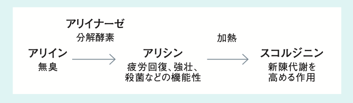 さらに、このアリシンを加熱するとスコルジニンと呼ばれる新陳代謝を高める作用をもつ物質に変化します。