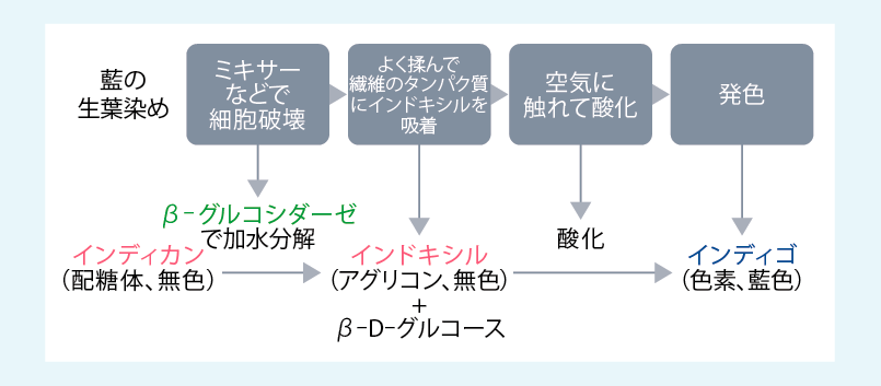 アイタデの葉を自然乾燥すると、乾燥中に細胞内の水分が失われて細胞構造が破壊され、細胞質中に存在する配糖体のインディカン(無色)が液胞内の酵素(β-グルコシダーゼ)と接触して加水分解されてインドキシル(無色)になり、インドキシルがやがて酸化されてインディゴ(藍色)となります。それにより、乾燥葉が藍色に変化します。