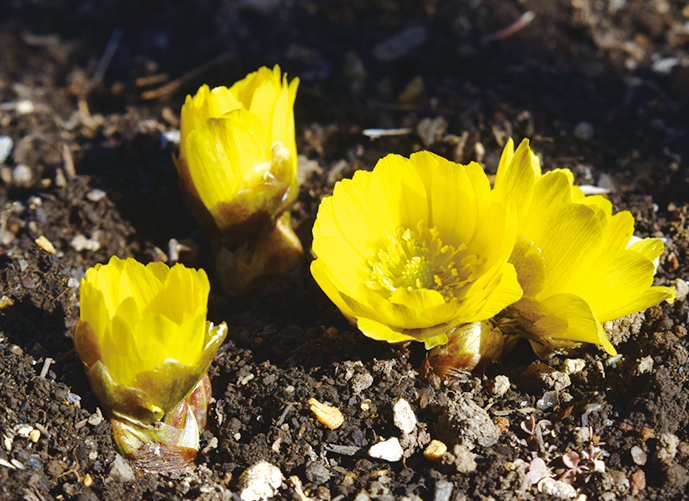 フクジュソウの芽生えはフキノトウに似た姿で地上に現れるため、誤食による食中毒に注意。心臓麻痺などの危険性も。