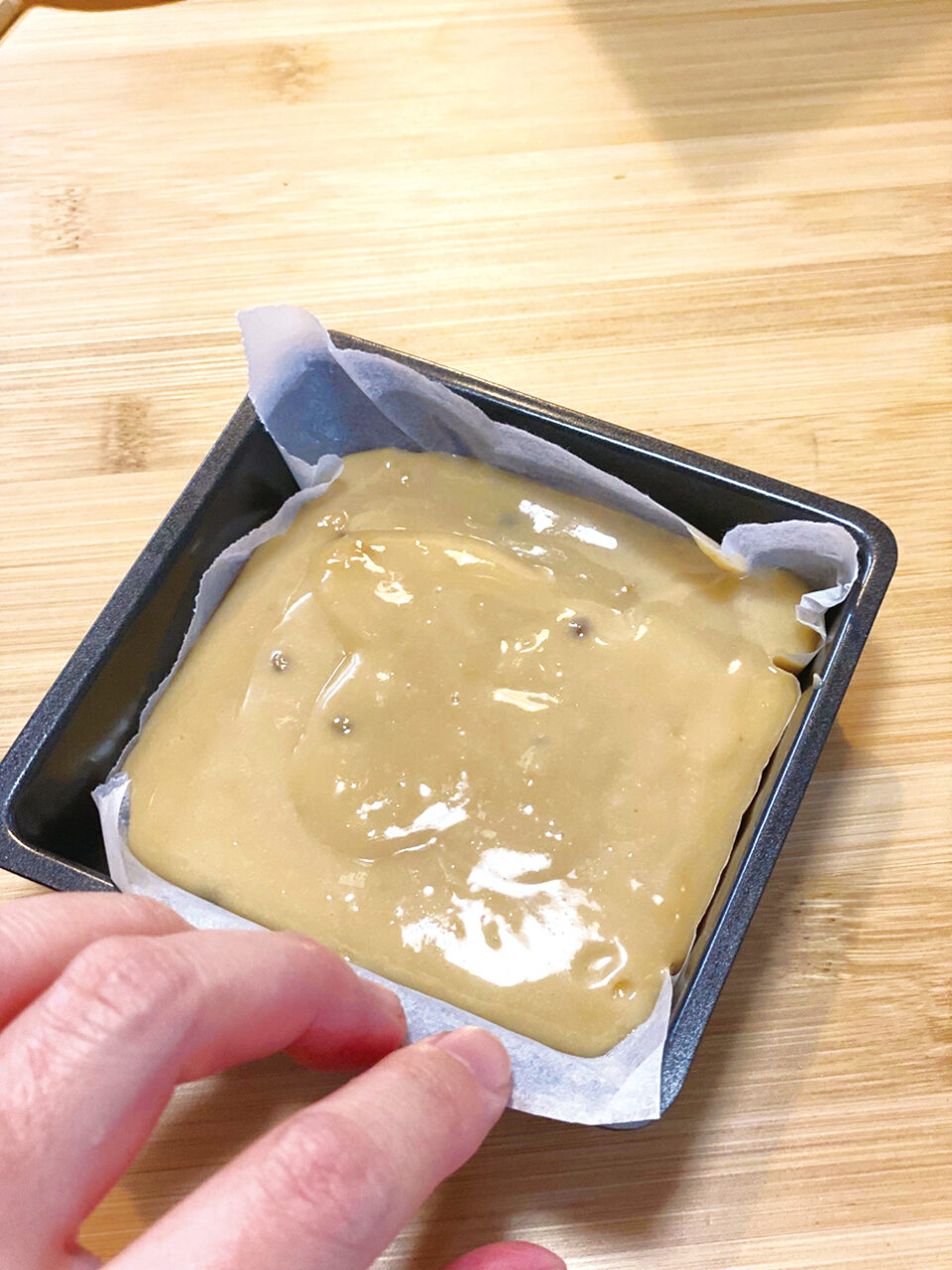 少し色が変わり、氷水に落とした時に固まるようであれば、クッキングペーパーを敷いた型に移し、粗熱をとる。カルダモンの鞘は取り除く。