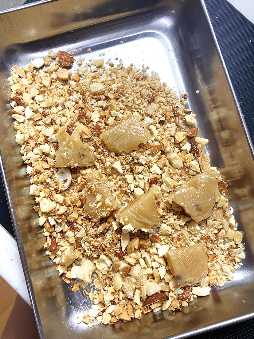 粗熱がとれたらお好きな形にカットして、砕いておいたお好みのナッツをつける。