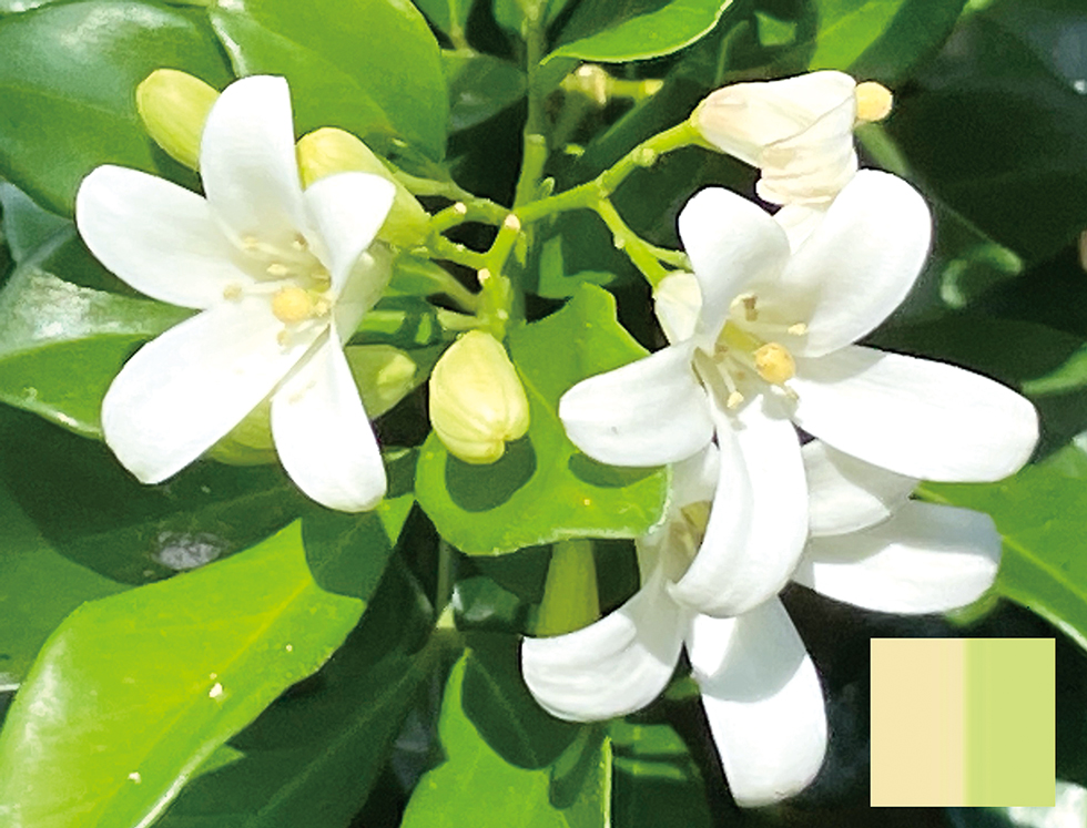 奄美大島から東南アジアにかけて分布するミカン科の小高木です。石垣島では隆起珊瑚礁の海岸に多く見られます。ミカンに似た白い花は柑橘系の甘酸っぱい香りがよく、内地ではシルクジャスミンとも呼ばれ観葉植物として流通しています。同属のカレーリーフ(オオバゲッキツ)は、葉にスパイシーな香りがあり、インドやスリランカではカレーなどの料理の香りつけに用いられます。