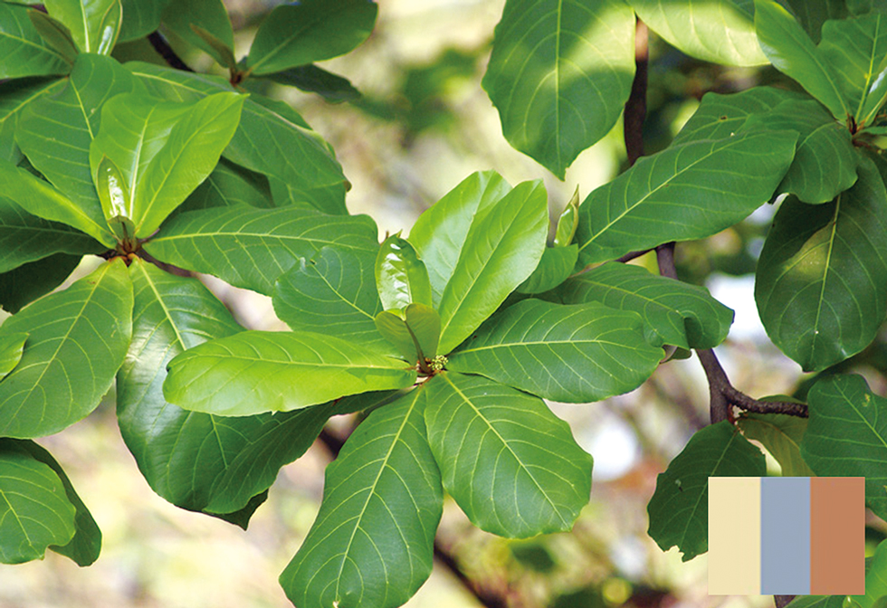 30㎝近い大きな葉を染色に使いますが、幹や枝でも異なった色が楽しめます。色は黄土色~鉄色系まで多岐にわたります。モモタマナの葉は水質改善機能が高く熱帯魚などの水槽の水質改善にドクターリーフとしても利用されます。