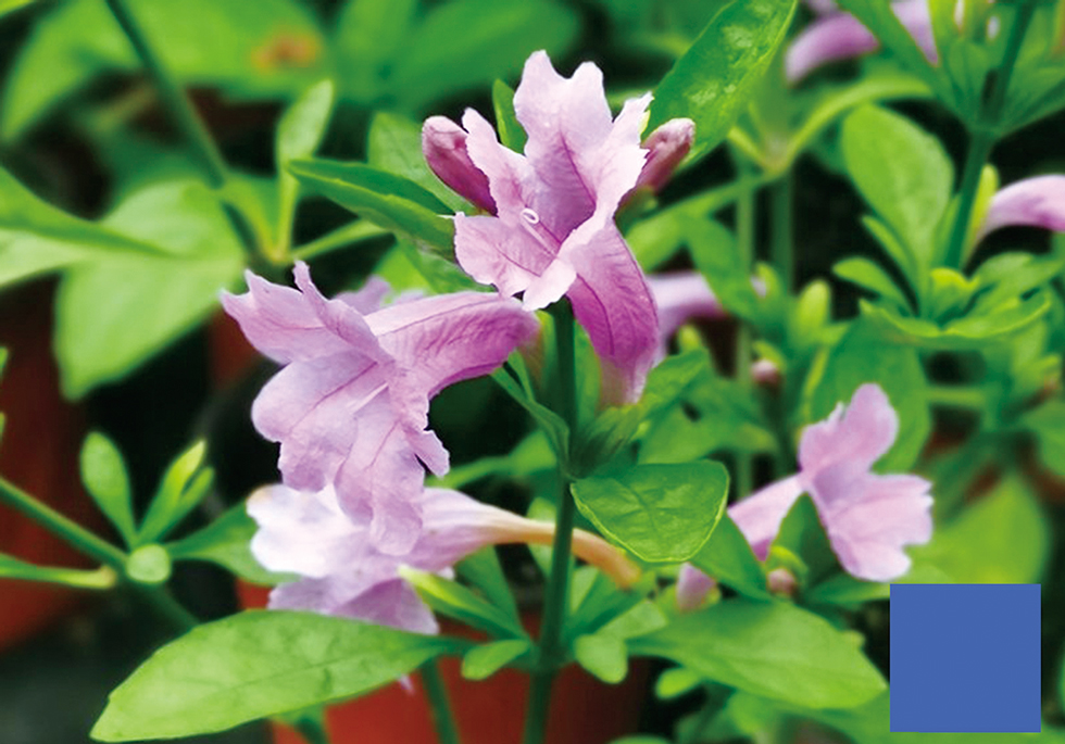 染めの代表的な植物はリュウキュウアイ。夏から秋に枝の先に淡い紅紫色の花をつけ、葉に青色の色素のインディゴを含みます。