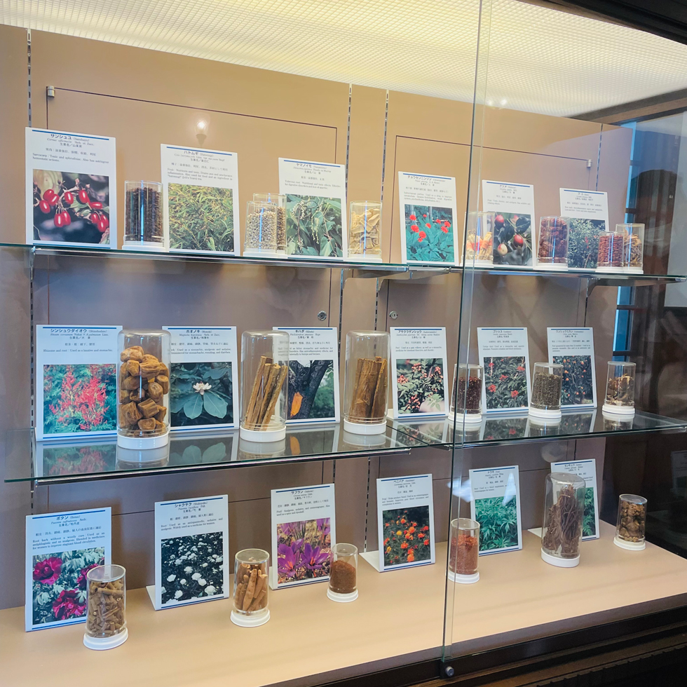 最初に案内していただいた歴史ある展示棟には、ルバーブや甘草、牛黄(牛の結石)などの生薬が展示されていました。その後、香草薬園、民間薬園、温室、漢方処方園など、94,000㎡に及ぶ敷地で栽培される3,000種を超える植物の中から、その一部を見学させていただきました。
