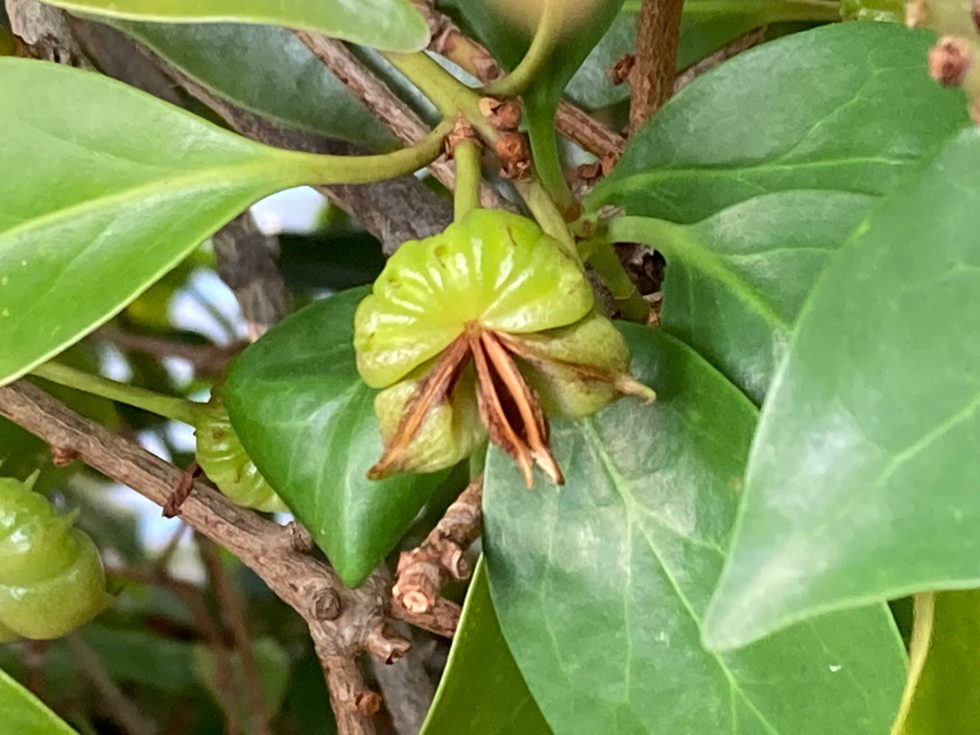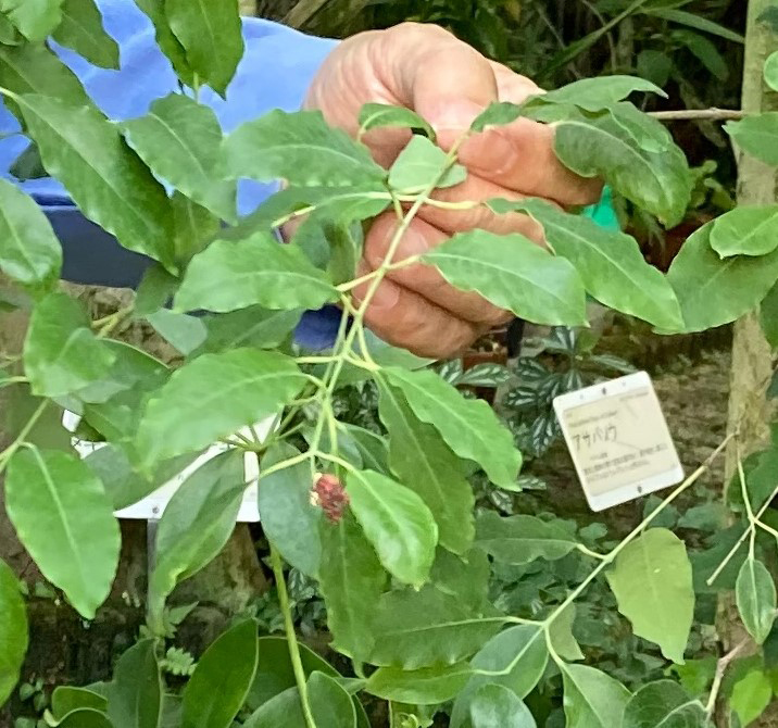 そして見学会。まず初めに大温室へ行きました。温室の入口にある樹木の中にあの貴重なサンダルウッドの木があり、テンションが急にアップ! サンダルウッドの葉や一つだけ残っていた花を見ることができて始めから内心大興奮状態!ほかにもこちらの温室には植物療法でおなじみの植物を次から次に見ることが出来ます。そんな中、絶滅危惧種の植物もありました。