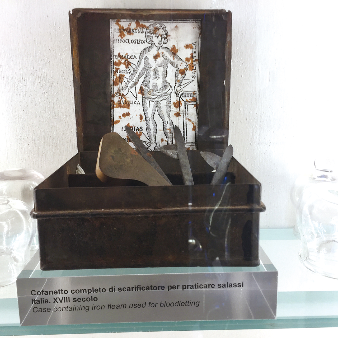 また、中世において代表的な医療処置に「瀉血」があります。余分または、悪くなったと考えられる血液を体外に捨てる、つまり血管を切ったり、吸血虫ヒルを皮膚に置いて血を吸わせたり、吸い玉という吸引器具で吸い取ったりすることです。