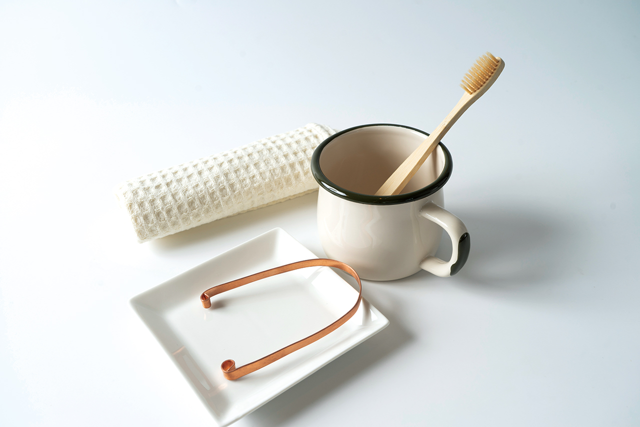 専用のタングスクレーパーや大きめの金属製のスプーンを使い、舌の奥から先に向かって10回ほどこすり、舌にたまった舌苔を取り除く。