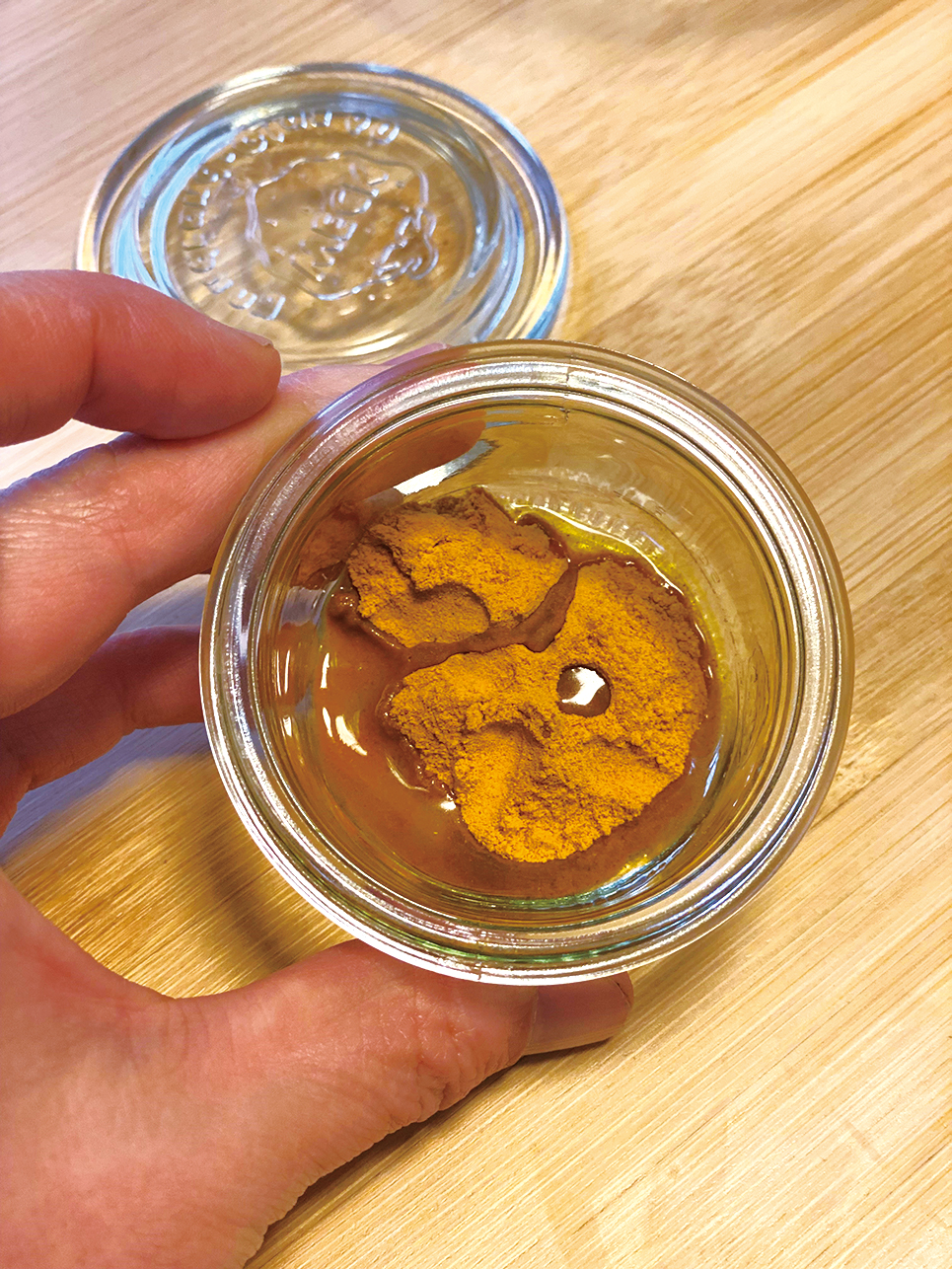 ハーブ&スパイスパウダー2に対して、ココナッツオイル1を混ぜる(写真はターメリックパウダーを使用)