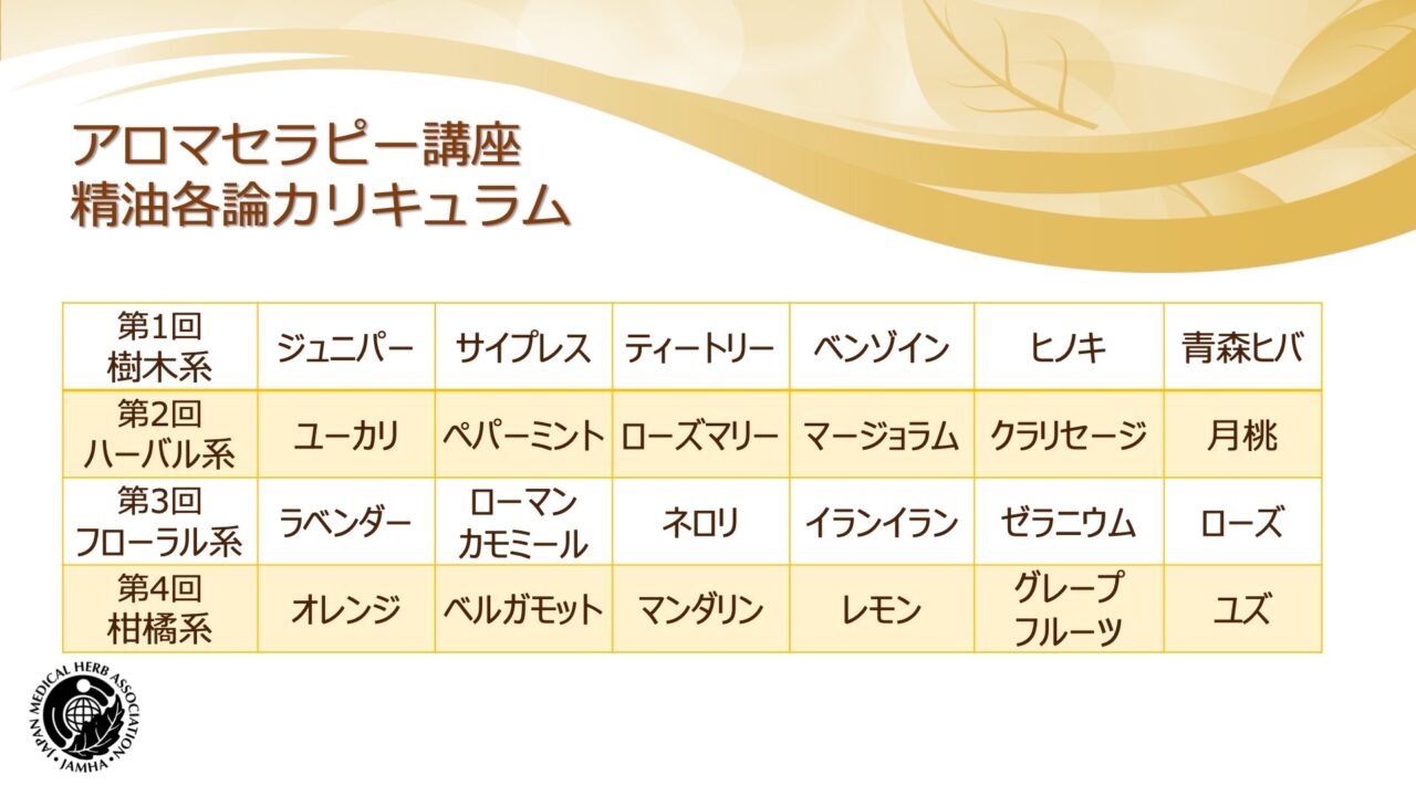 前半は、現代社会で特にニーズが高まっている感染者予防や心身症・生活習慣病予防、さらには女性のためのアロマセラピーや高齢者・介護領域のアロマセラピーについて精油の活用の狙いや具体的な活用法を学びます。