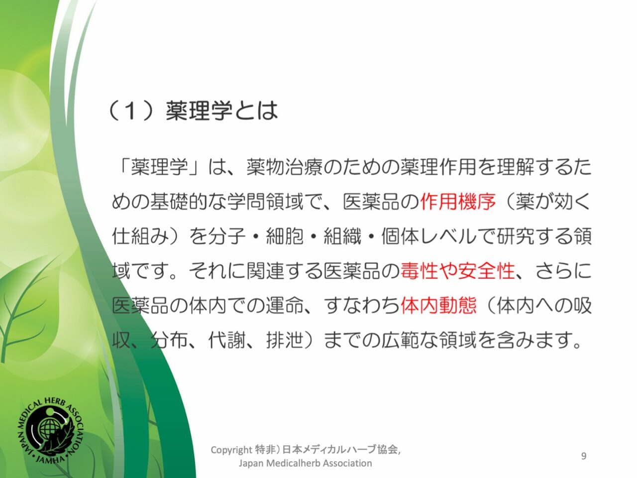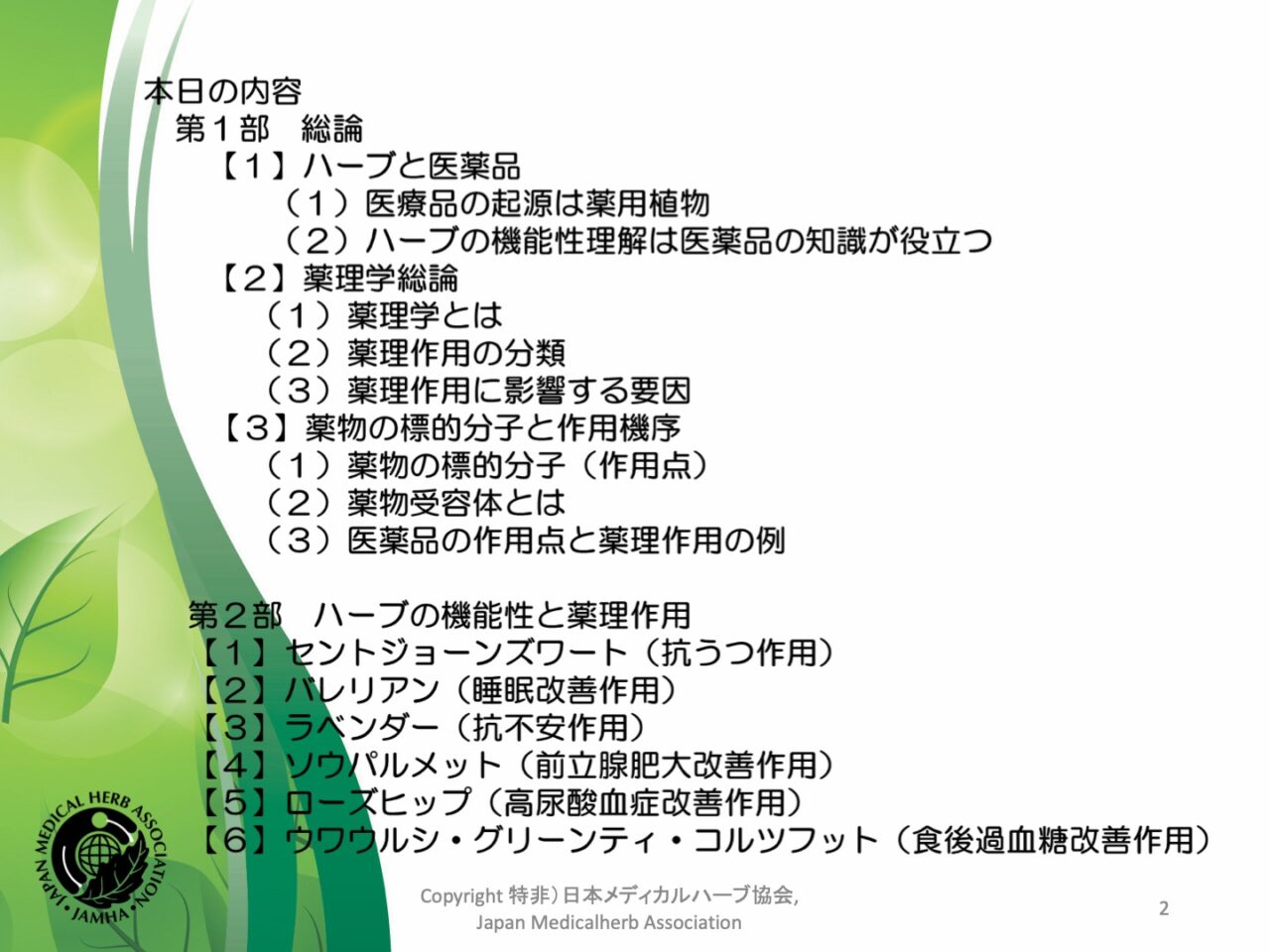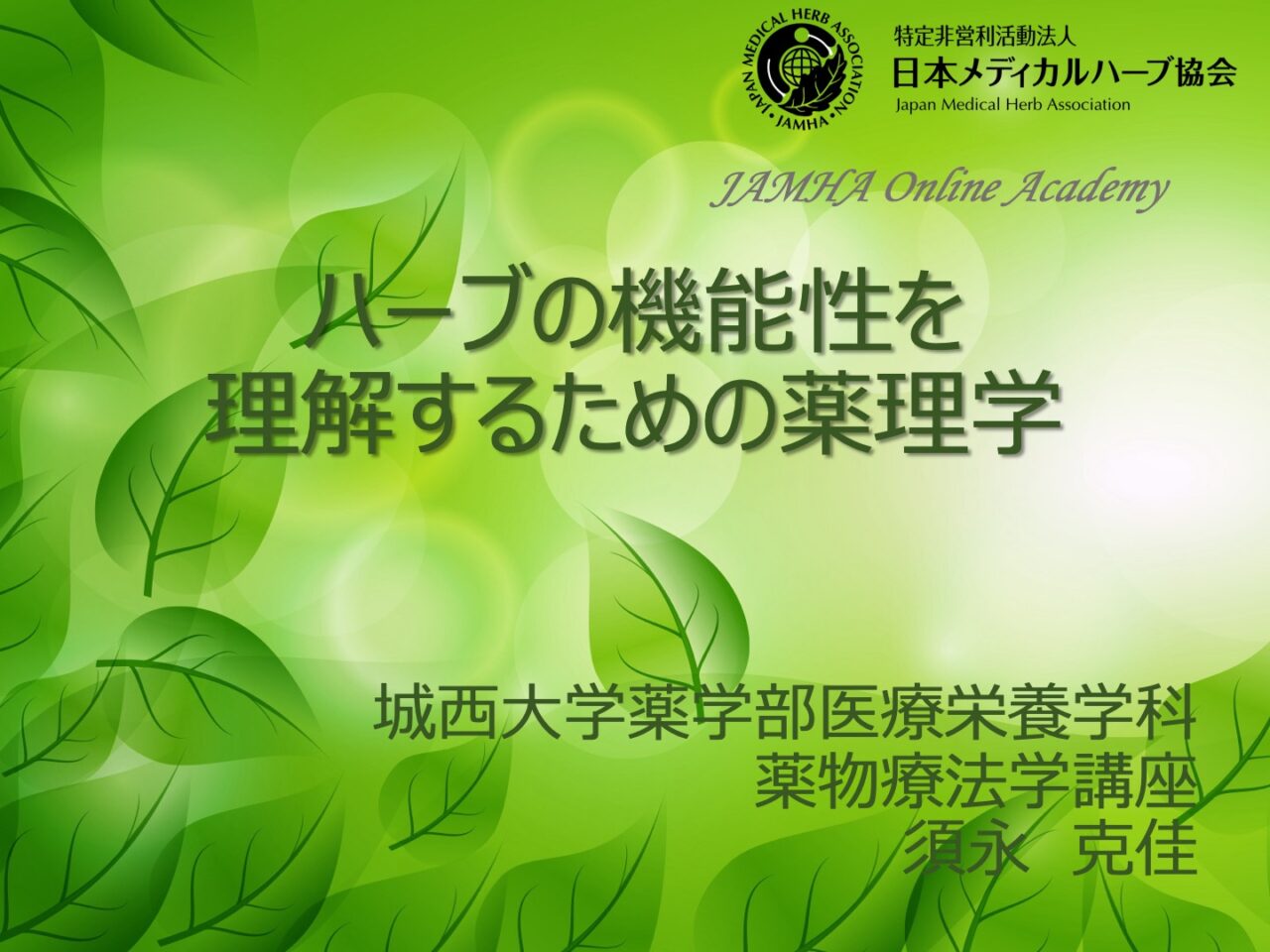 ハーブの機能性をより理解するための「薬理学」について概説するとともに、作用機序が推定されているハーブを例にとってその機能性を医薬品の作用機序と比較しながら解説します。