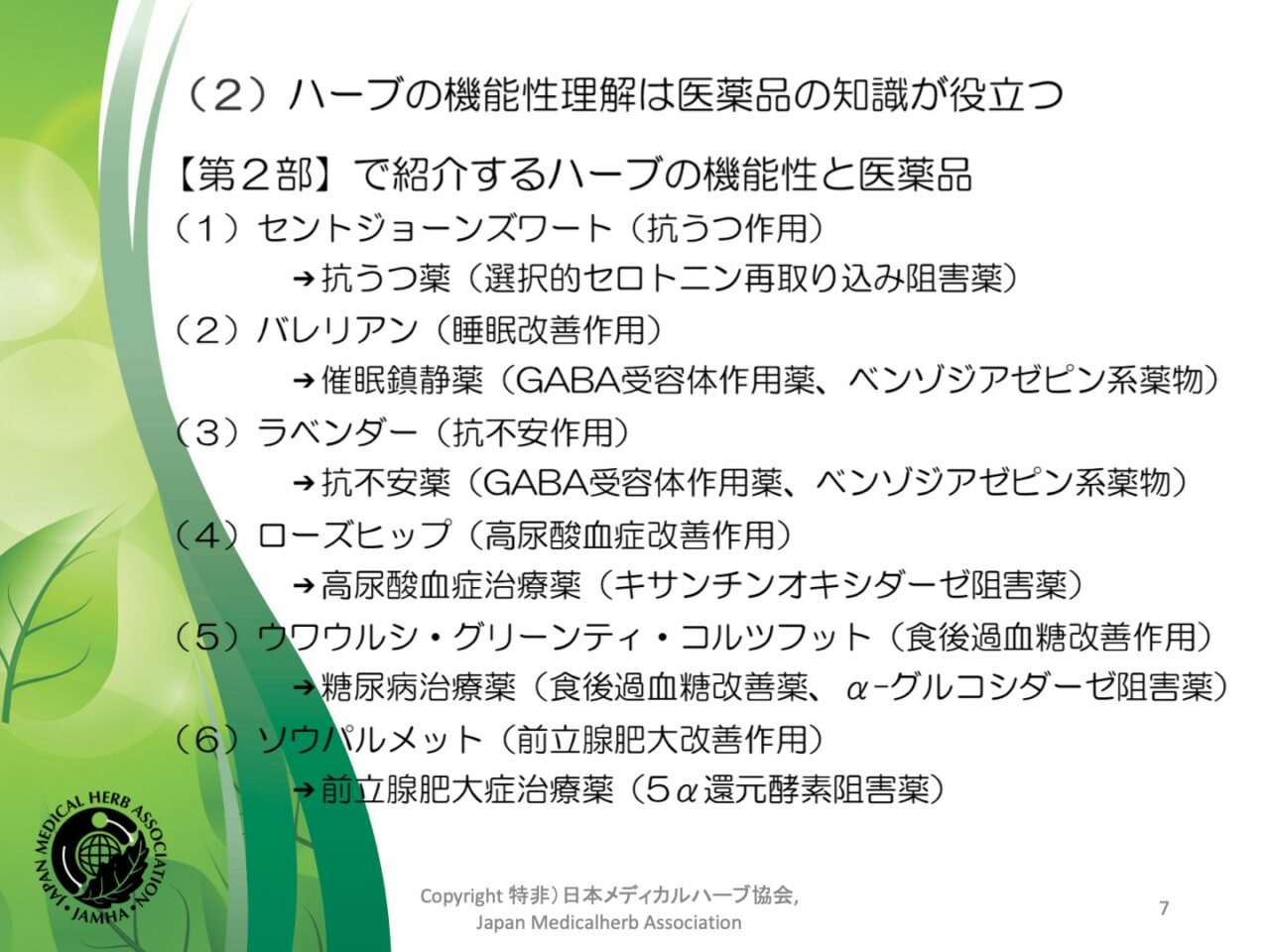 本講座ではハーブの機能性をより理解するための「薬理学」について概説するとともに作用機序が推定されているハーブを例にとってその機能性を医薬品の作用機序と比較しながら解説します。セントジョーンズワート(抗うつ作用)、バレリアン(睡眠改善作用)、ラベンダー(抗不安作用)、ローズヒップ(高尿酸血症改作用、筆者による新規知見)、ウワウルシ・グリーンティー・コルツフット(食後過血糖改善作用、筆者による新規知見)、ソウパルメット(前立腺肥大改善作用)を扱います。また、ハーブの毒性にも目を向けて毒性の機序についても一部触れます。それらを学ぶことによりハーブの機能性の原理と個々のハーブの機能性をより深く理解するための知識を身に付け、ハーブの適切な使用とハーブ療法への活用に発展させられる基礎的知識を学びます。