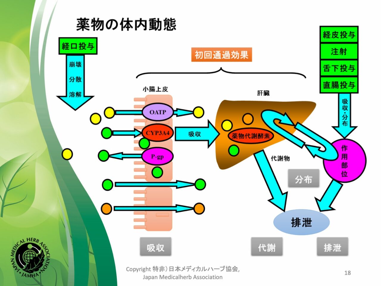 メディカルハーブは医薬品と同じように身体に作用して機能性(医薬品でいう薬理作用)を発揮しています。「薬理学」は、薬物治療のための薬理作用を理解するための基礎的な学問領域で、医薬品の作用機序(薬が効く仕組み)を分子・細胞・組織・個体レベルで研究する領域です。それに関連する医薬品の毒性や安全性、さらに医薬品の体内での運命、すなわち体内動態(体内への吸収、分布、代謝、排泄)までの広範な領域を含みます。