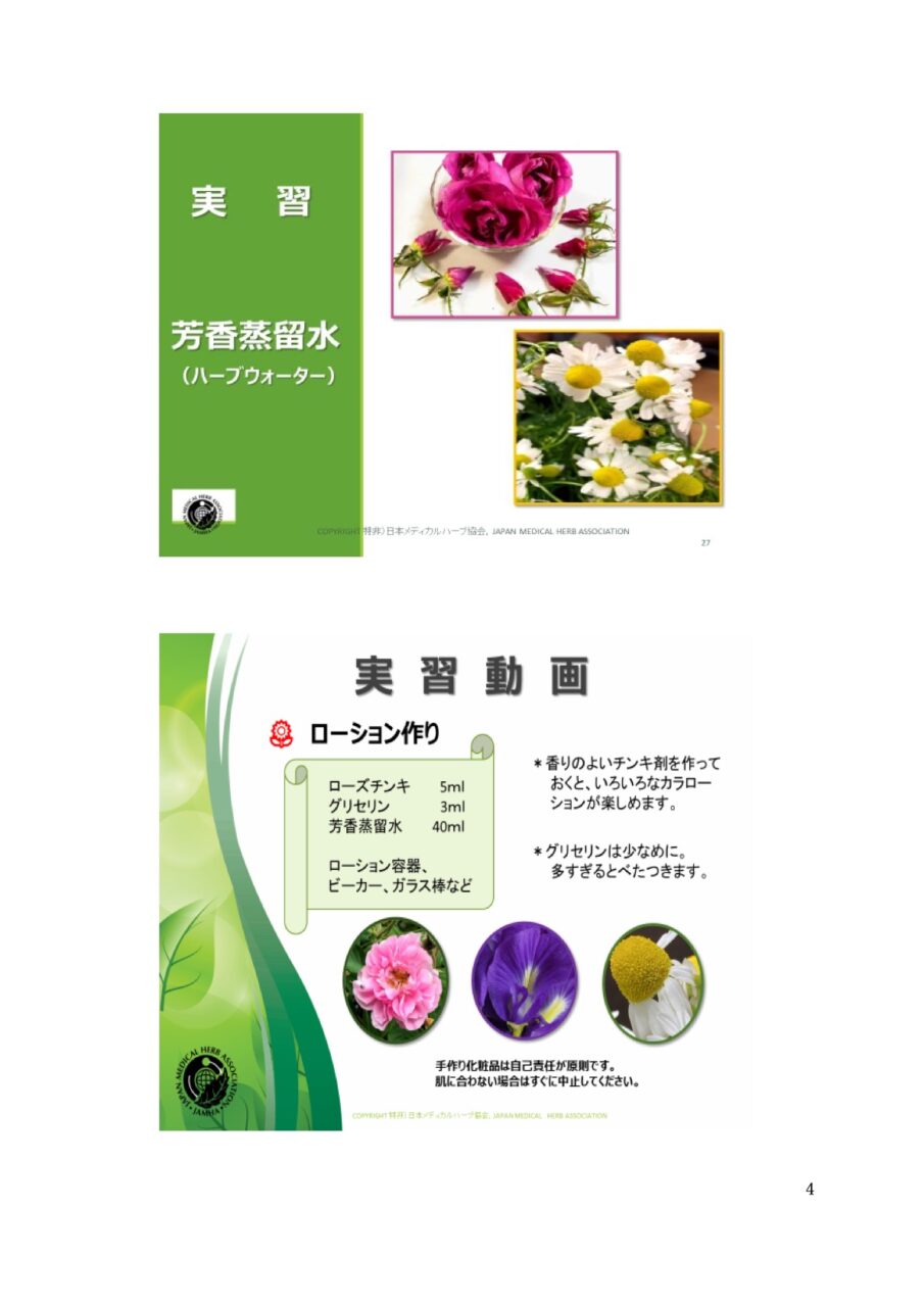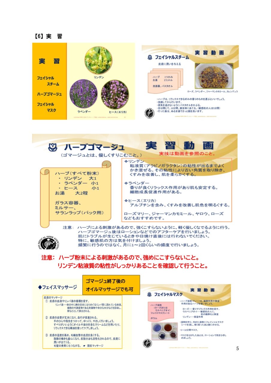 また、本講座は理論編と実習編に分かれており、中でも第 4 回目のハーブゴマージュは、肌に対して強い刺激が懸念されるため、今回あえて実習に取り入れました。是非、参考にしてください。