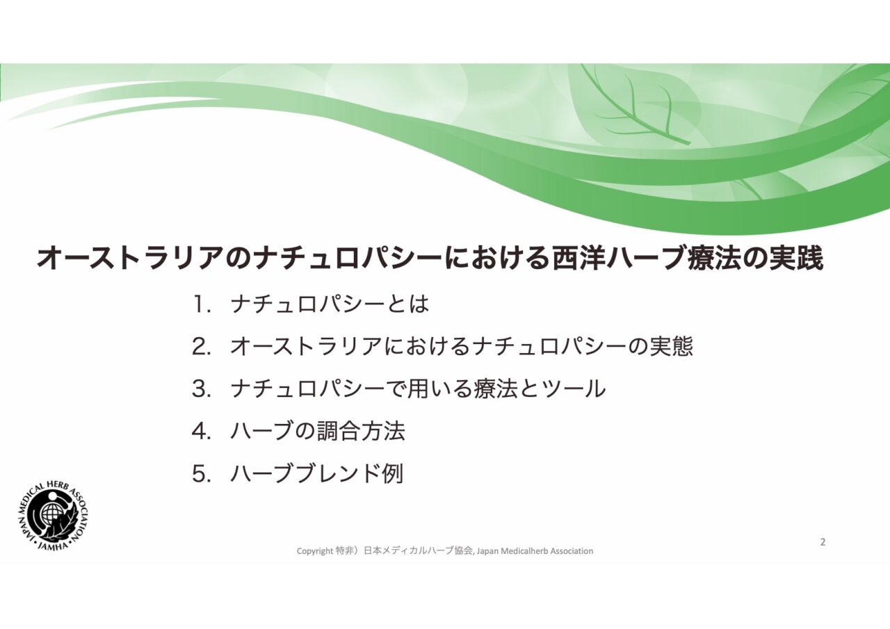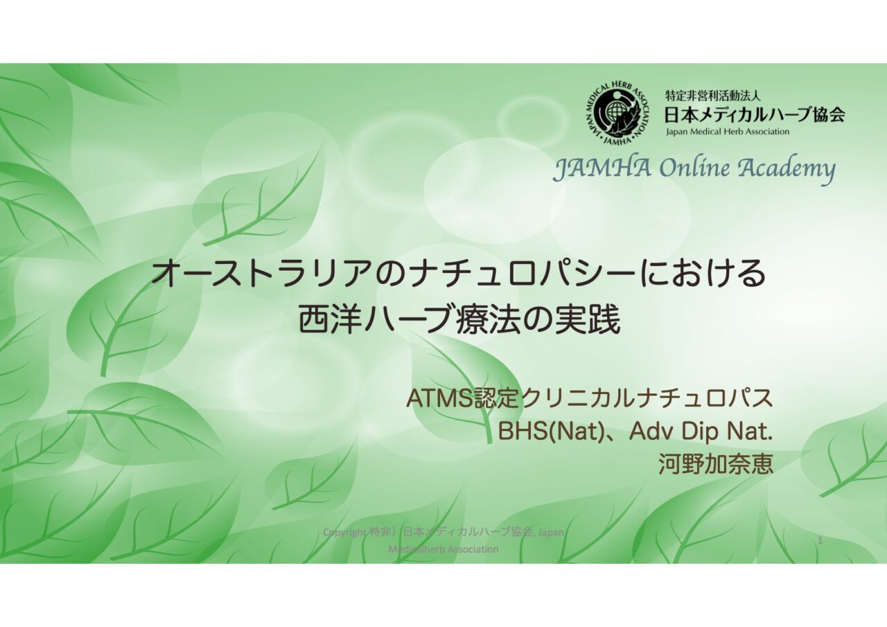 この講座から、「補完代替療法」で求められるものは何か、実際に現在のオーストラリアにおけるナチュロパシーはどのように取り扱われているのか、また、その中で西洋ハーブ療法をどのように利用して、人々の健康を実現しようとしているかについて学びます。