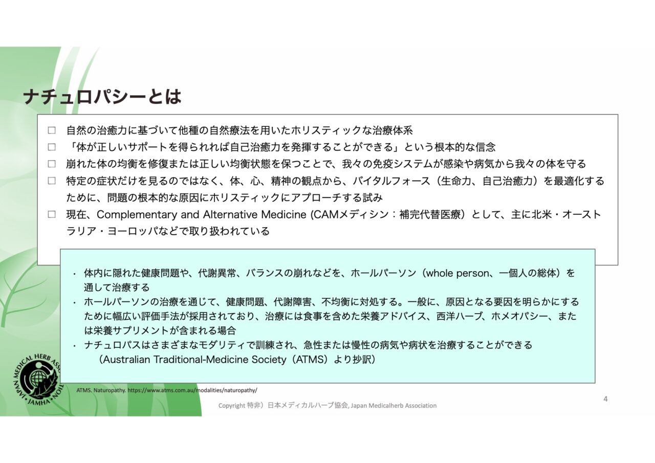 ナチュロパシーでは食事、栄養療法、西洋ハーブ療法、ライフスタイルを用いて自己治癒力を高めます。オーストラリアで現在行われているナチュロパシーの医療哲学とその中での西洋ハーブの使い方について学びます。