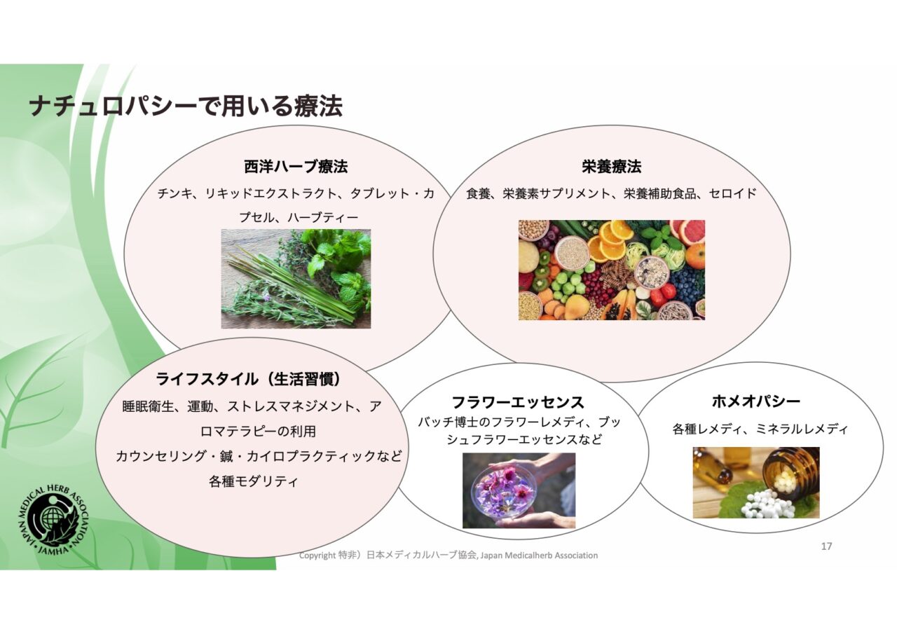 - 現在のナチュロパシーで主に利用する各療法とツール、およびリキッドハーブについて