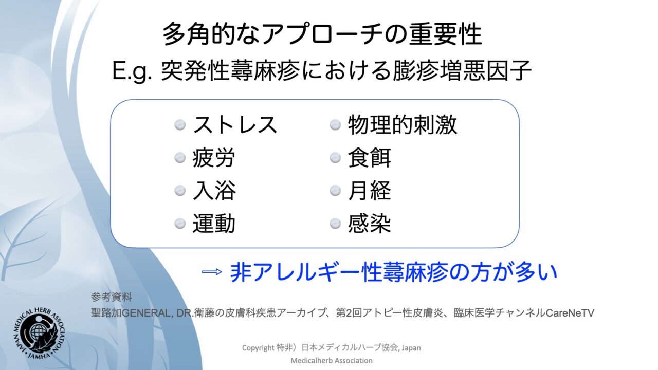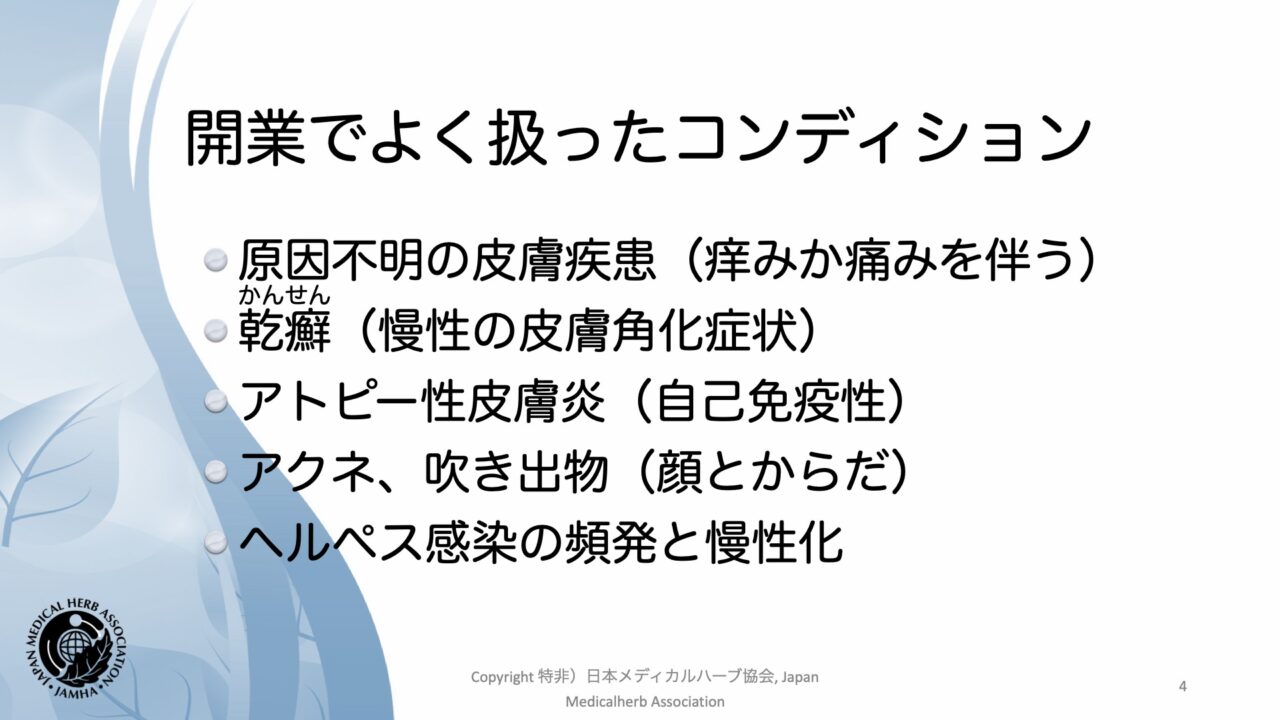 アトピー性皮膚炎などの慢性皮膚疾患においてハーブをどのように用いるかを学びます。実際にどのようなハーブをどのような形で用いられてきたか、使用においての注意点、また、トリートメントに際し多角的にアプローチするために何を考えて行うかなどの症例などを通して実践経験でのハーブの使い方を多角的な視点で紹介します。
